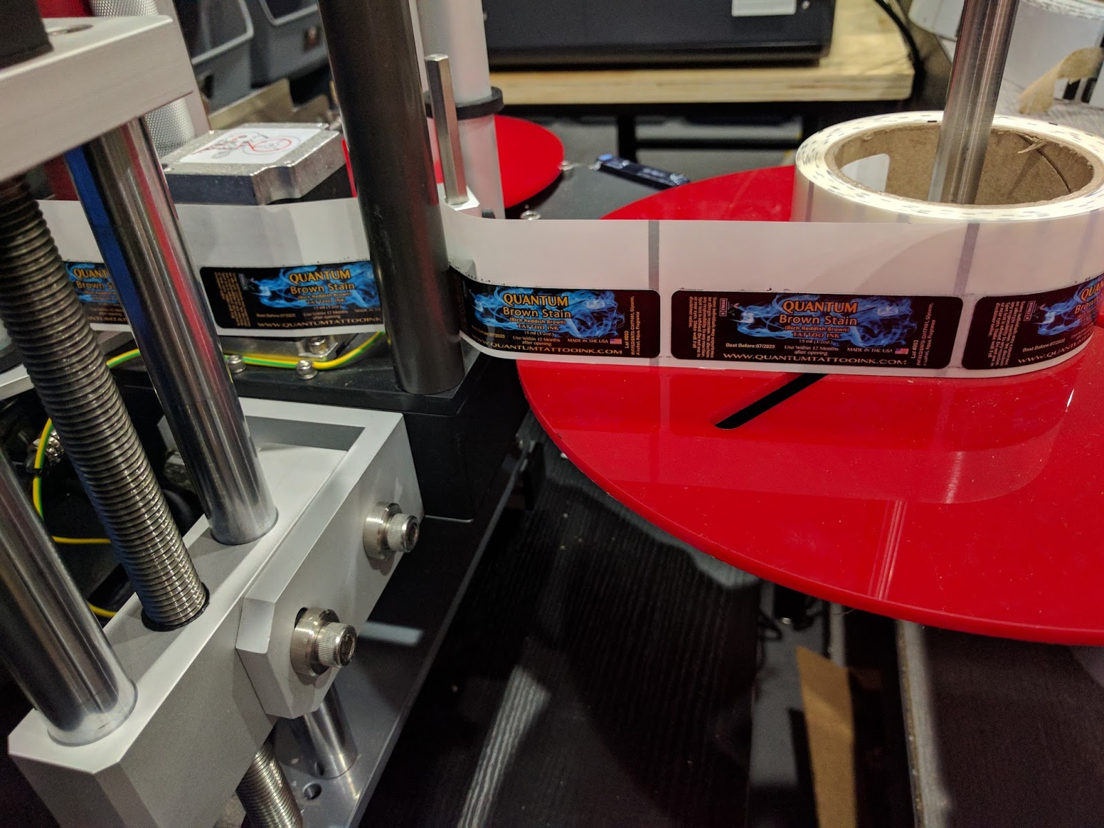 This applicator, however, would not allow us to account for the .5” liner on the “bottom” side of the label.  Normally, exposed liners are approximately only 3 mm or less.  Attempting to apply the 1” labels centered, we would have place them above the start of the taper on the bottle.  Therefore we had to move the label from the center.
