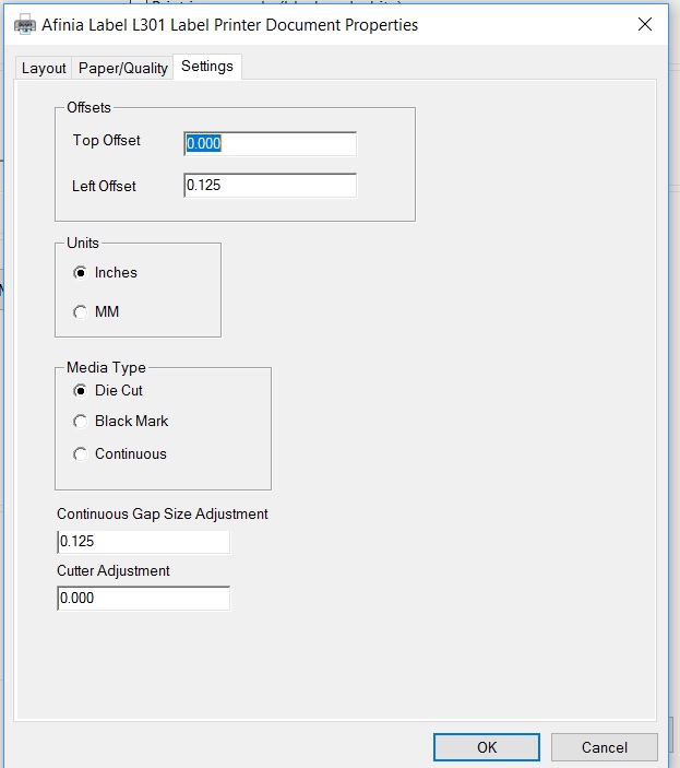 As you can see, my right side was printing on the liner. To adjust this print start position, I had to simply add space on the “Left Offset” in the driver, found on the “Settings” tab.