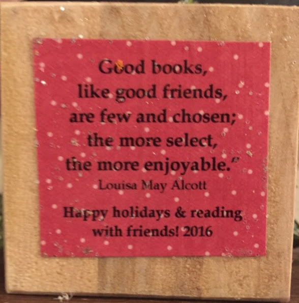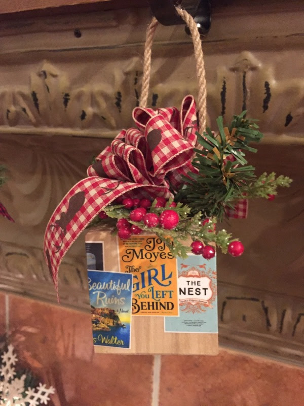 It seems she wanted to produce something special for her book club.  According to Carrie, “our book club has been together for more than 8 years.  And this year, I just happened to be hosting our December meeting.  Given it was the end of the year, I wanted to make something special for our club that commemorated the books we’d read.  I checked Pinterest; and found only different bookmark ideas.  Given that many of our club members use e-readers, bookmarks seemed out-of-date.   So, I decided to make an ornament with book cover images of the books we read January thru December.”