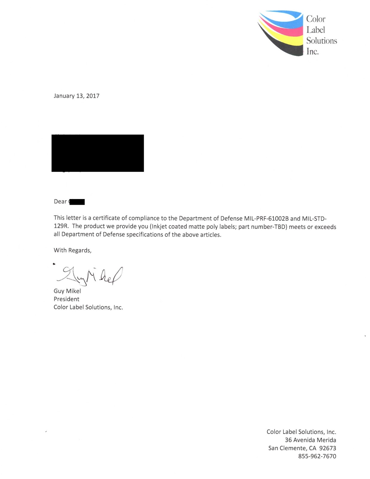 Inkjet Coated, Color, MIL-SPEC Compliance Letter