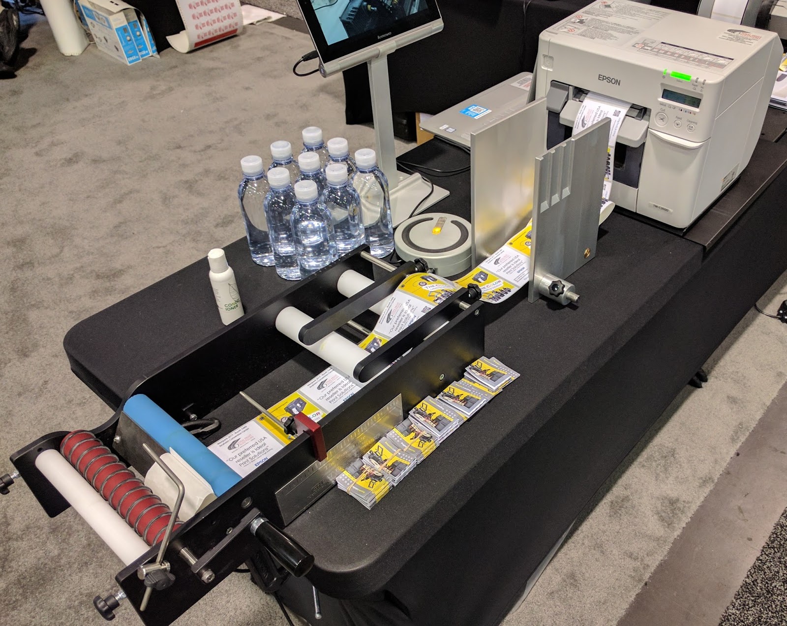 In addition out the new CYMK printer, we saw in-person a new item we’ll begin selling next month; the BenchMax round container applicator integrated with the C7500 and C3500 printer: